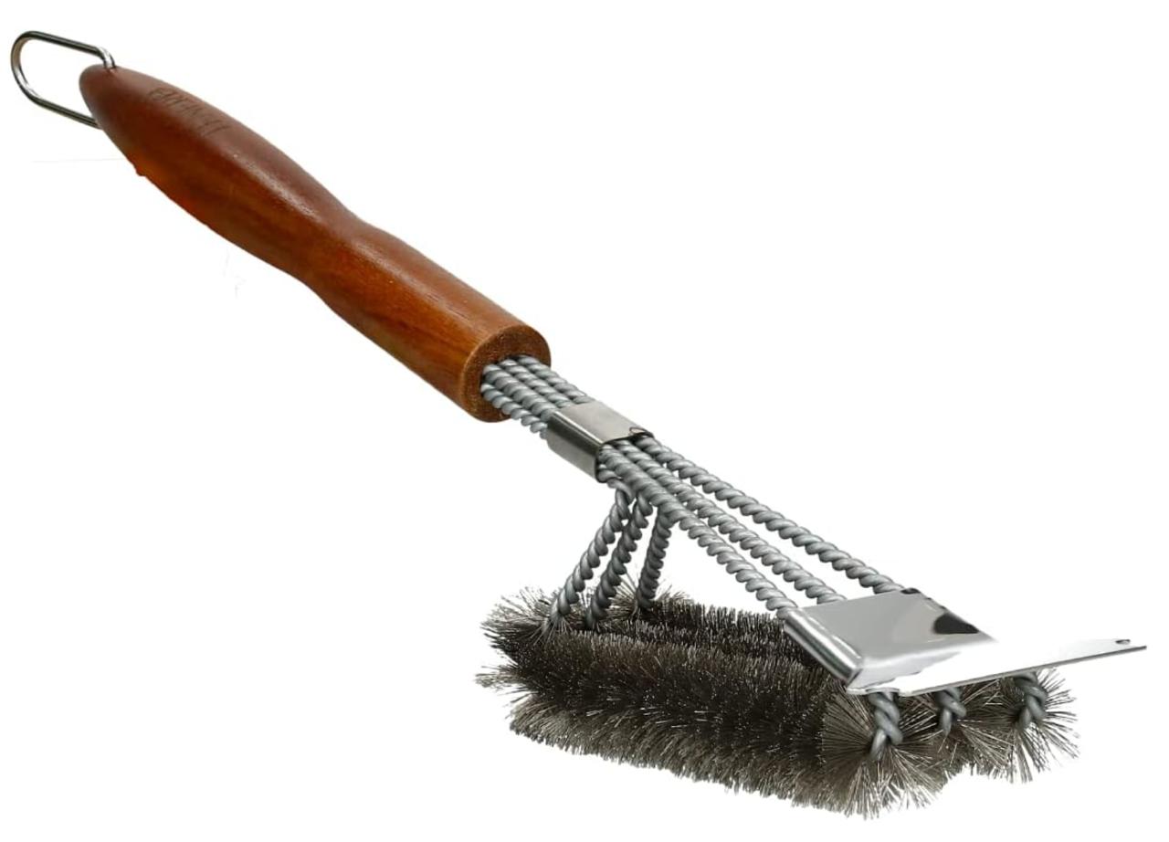 Die robuste Edelstahlbürste entfernt effektiv Rückstände und Verunreinigungen, während der ergonomische Griff aus Akazienholz für einen komfortablen Halt sorgt.