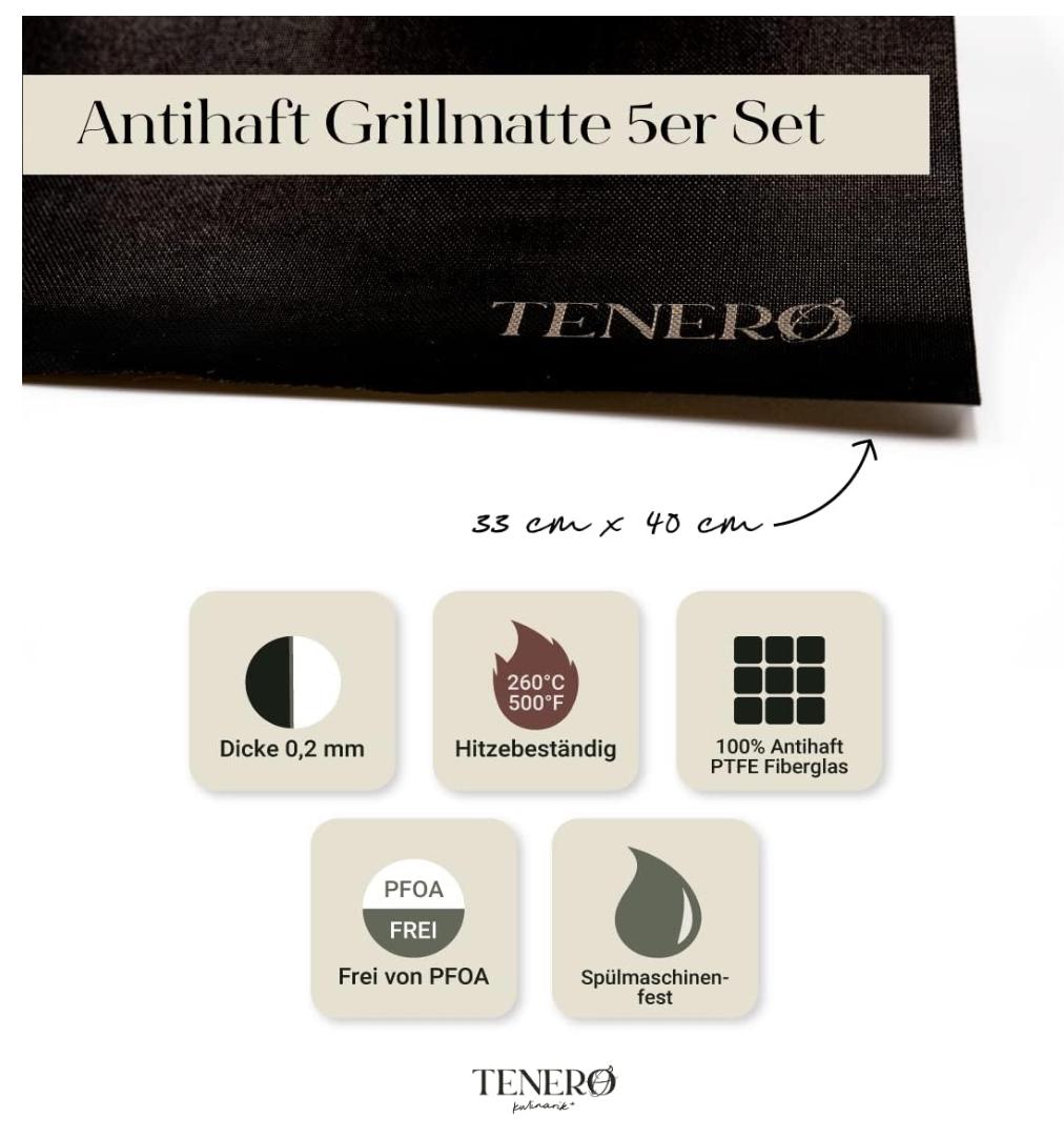 Entdecken Sie unser praktisches 5er Set Grillmatten "Tenero", ideal für ein perfektes Grillerlebnis! Jede Matte hat eine Größe von 33 x 40 cm und eine Dicke von 0,2 mm, wodurch sie hitzebeständig bis 260°C ist.