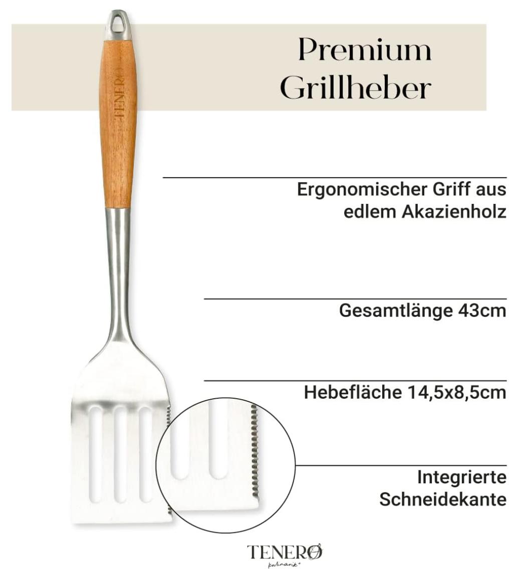 Der ergonomische Griff aus Akazienholz sorgt für einen komfortablen Halt und eine einfache Handhabung. Zudem verfügt der Grillwender über eine integrierte Schneidekante, die das Zubereiten Ihrer Grillgerichte noch einfacher macht.