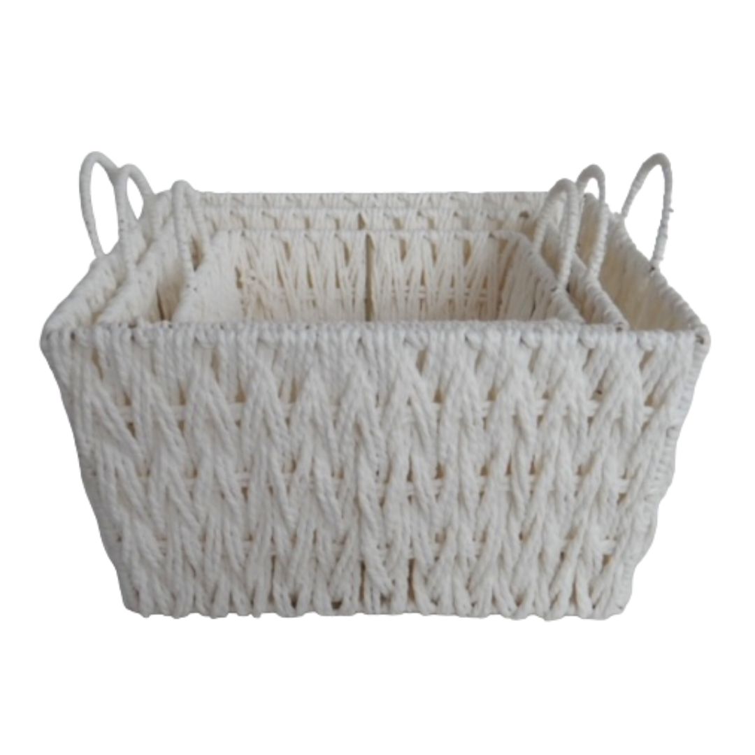 Dieses weiße Korbset gefällt durch das schöne Flechtmuster und die praktische Form mit Henkel. Es ist vielseitig verwendbar, z. B. als Dekoration oder zur Aufbewahrung von Gegenständen. Die Körbe sind ein ansprechendes Geschenk für jeden.