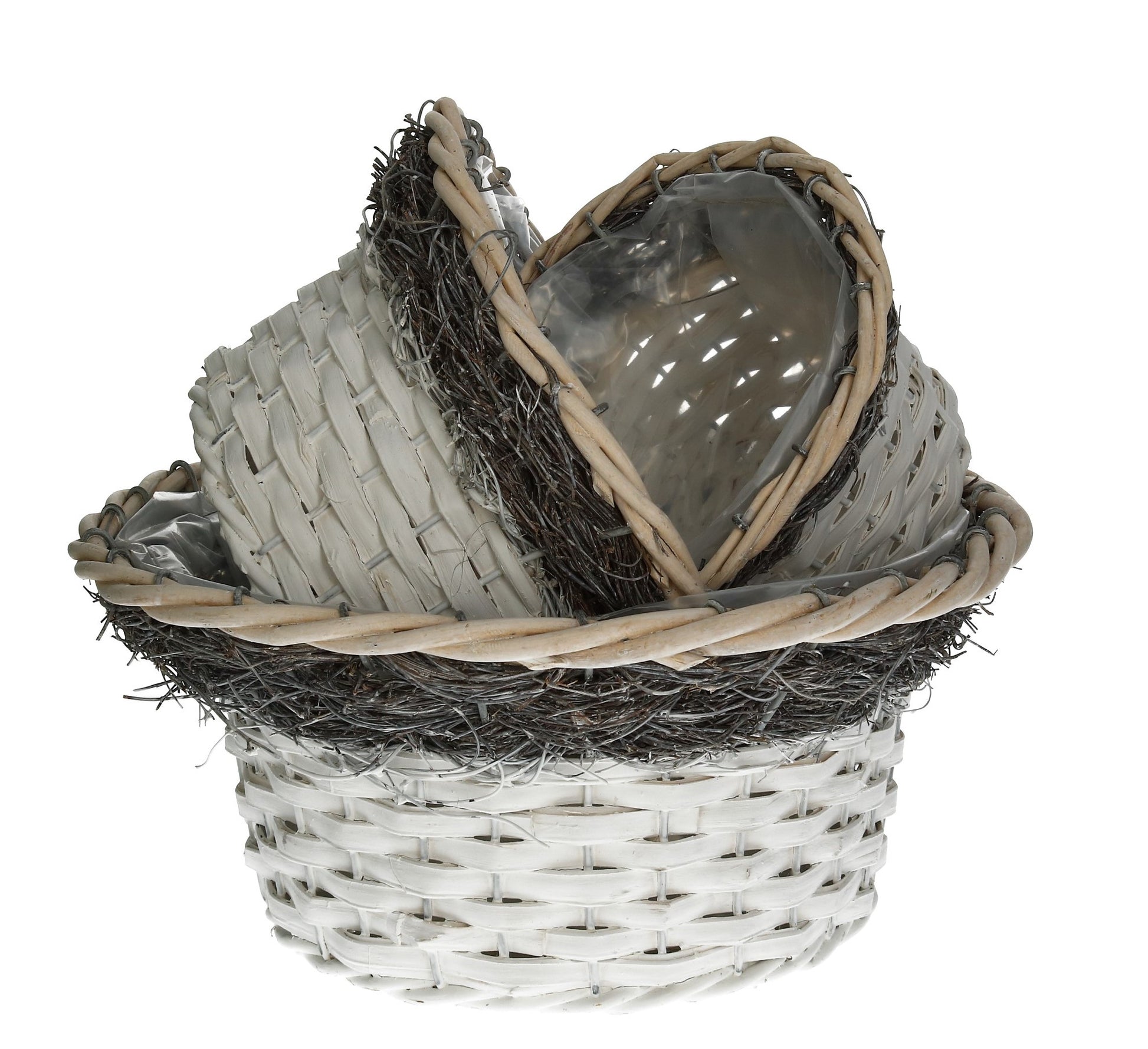Dieses dekorative Korbset gefällt durch den Material- und Farbmix. Die 3 unterschiedlich großen Körbe sind mit Folie ausgeschlagen und können sowohl als Dekoration oder Aufbewahrung, als auch zum Bepflanzen verwendet werden. Idelal zum dekorieren und verschenken!
