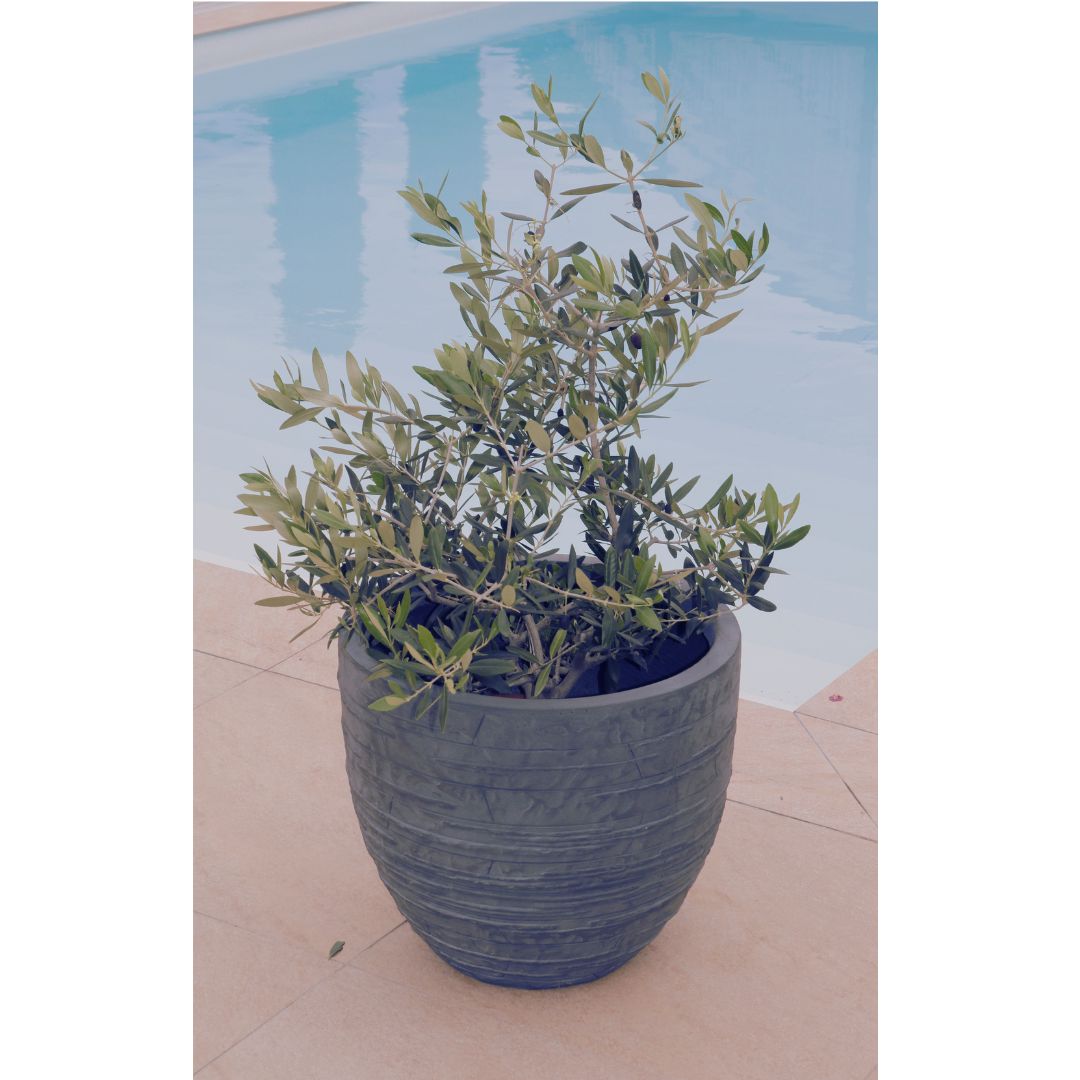 Runde Pflanzkübel aus Kunststoff mit Struktur in grau.